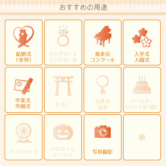 女の子の子供ドレスや子供ワンピースのレンタル、男の子の子供スーツのレンタル、七 三 五 正月 きもの 和装 和服でお悩みの際は、男児女児ともに70cmのベビーからキッズ ジュニア マタニティ レディース 大きめ 太目のぽっちゃりさんも、そしてシューズ・髪飾り・ボレロなどの小物まで、洋装・和装の豊富な衣装が揃う、にお任せください!