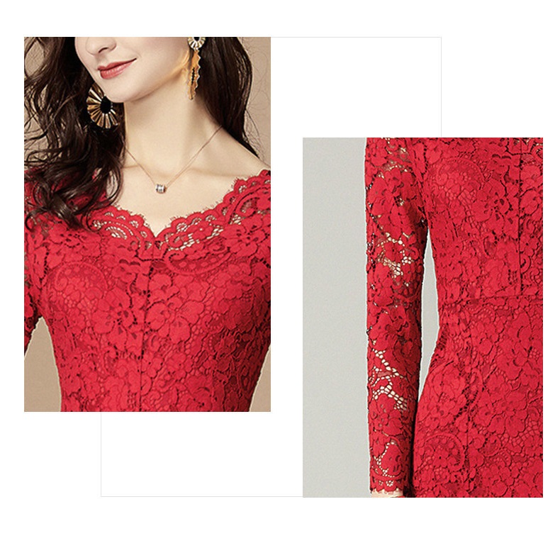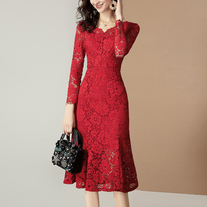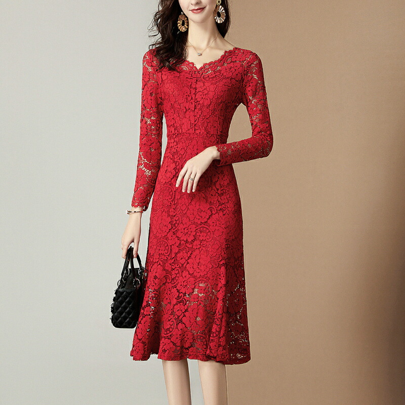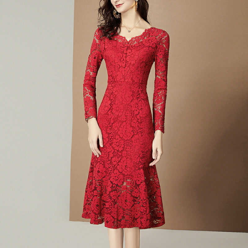 ワンピース レース 赤 優雅 レディース 春秋 夏 パーティードレス 上品 フォーマル 通勤 オフィス フェミニン ミモレ丈ワンピース ロング タイトワンピース Vネック お呼ばれ 結婚式 エレガント