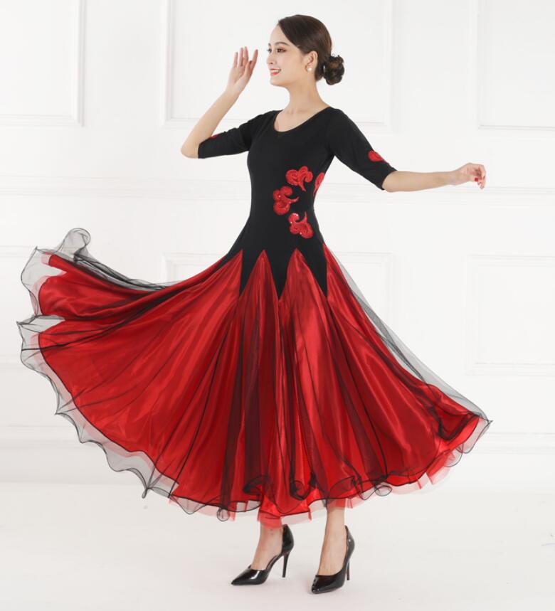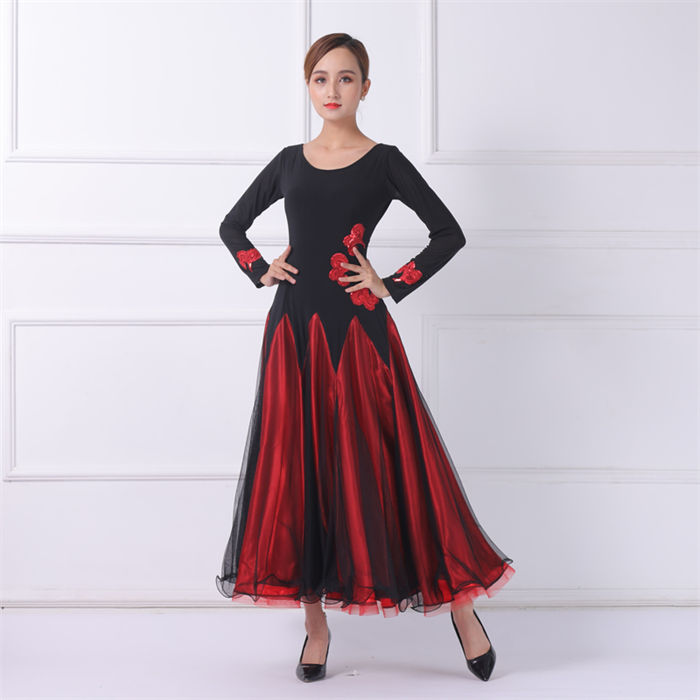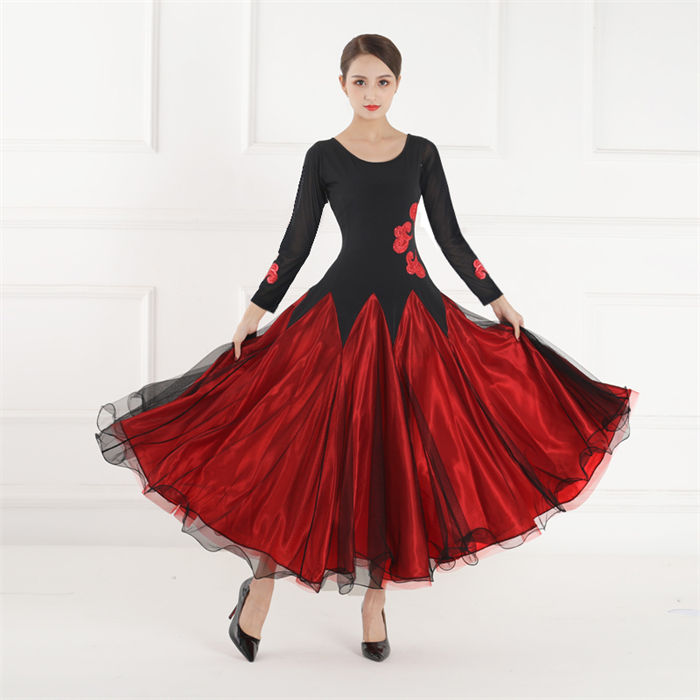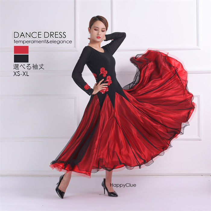 社交ダンス 衣装 ワンピース 大きい裾 レディースファッション 超目玉商品 S M L XL XXL レッド/半袖 レッド/長袖 ブラック/半袖 ブラック/長袖