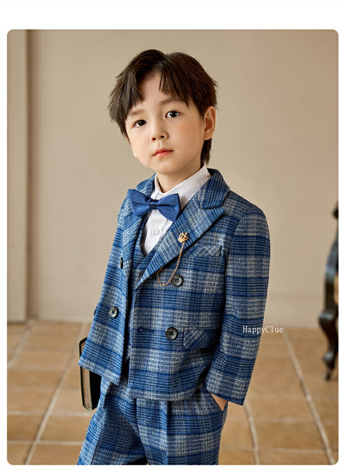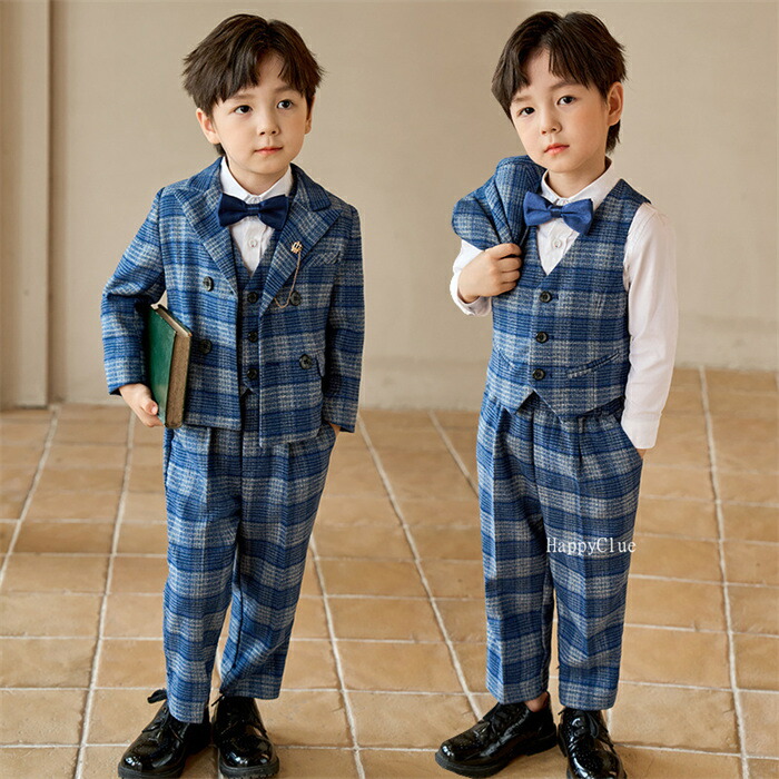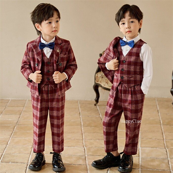 男の子 子供スーツ セットアップ キッズスーツ 卒業式 入学式 おしゃれスーツ チェック柄 子どもスーツ フォーマル 七五三 子供服 長袖 赤 レッド 青 4点 5点セット シャツ付 ブルー