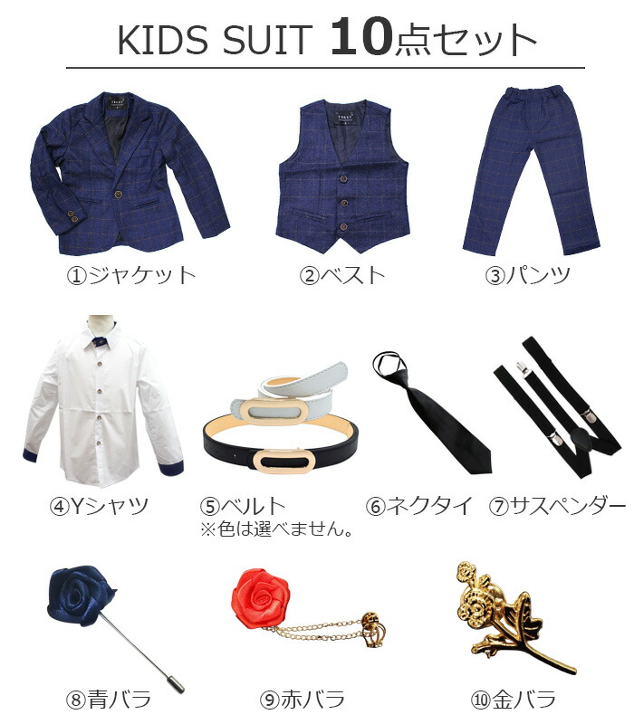 男の子 子供スーツ 10点セット ジャケット パンツ ベスト Yシャツ ネクタイ ベルト ブローチ サスペンダー ピン ブルー ネイビー パープル 格子柄 100cm 110cm 120cm 90cm