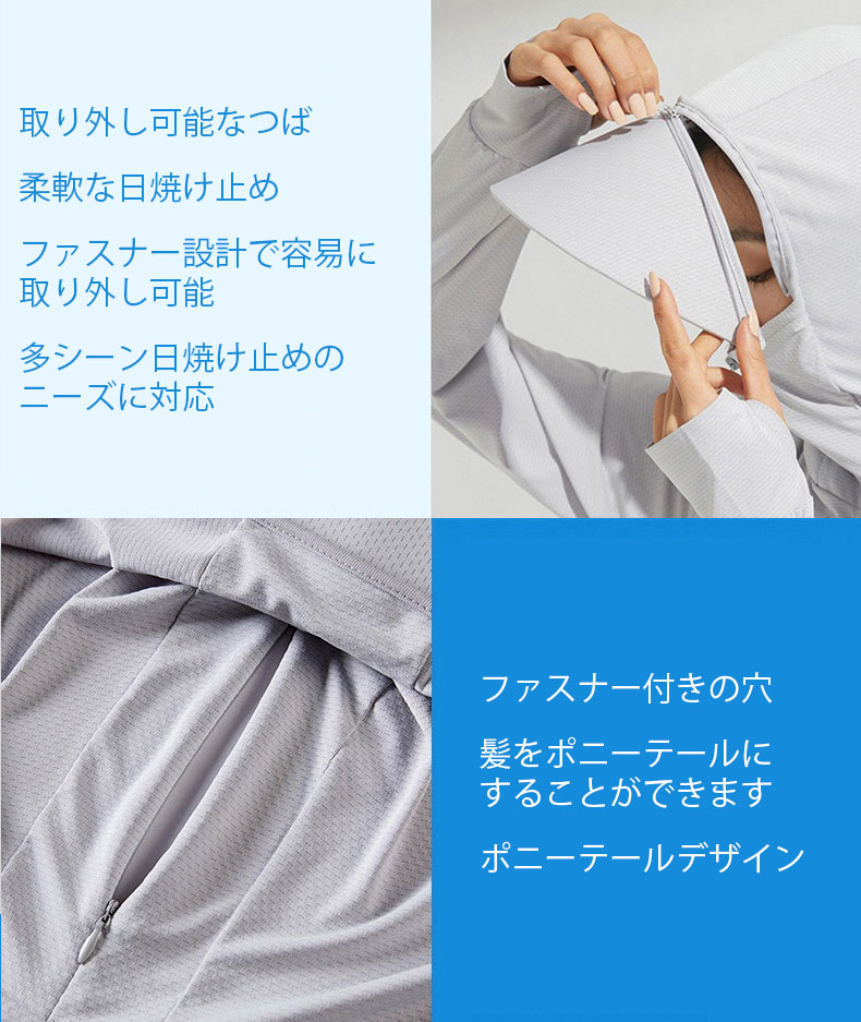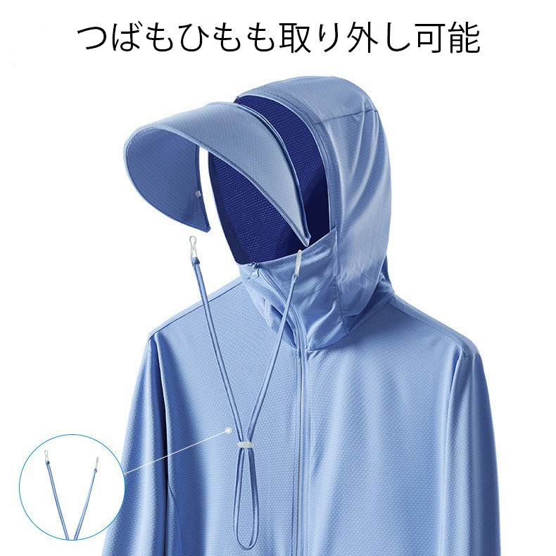 UV パーカー 速乾 冷感 -7℃ レディース 長袖 ラッシュガード UVカット アウター メッシュ 遮光 99% 素材 薄手 トップス 通気口 指穴 つば 顎紐 サンバイザー 日焼け 取り外し