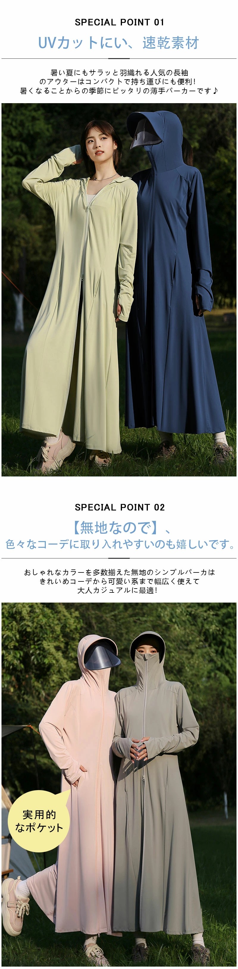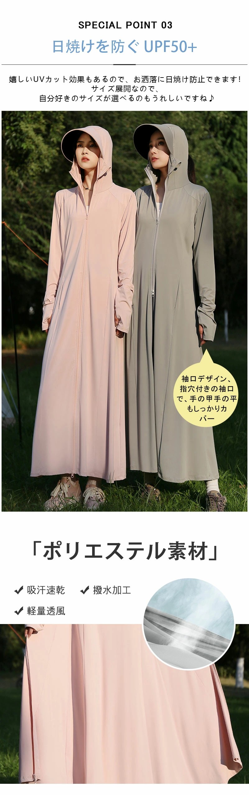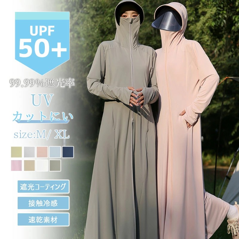 このアイテムは、アンクルまでの超ロング丈で、足元から頭までをしっかりと紫外線から守ります。