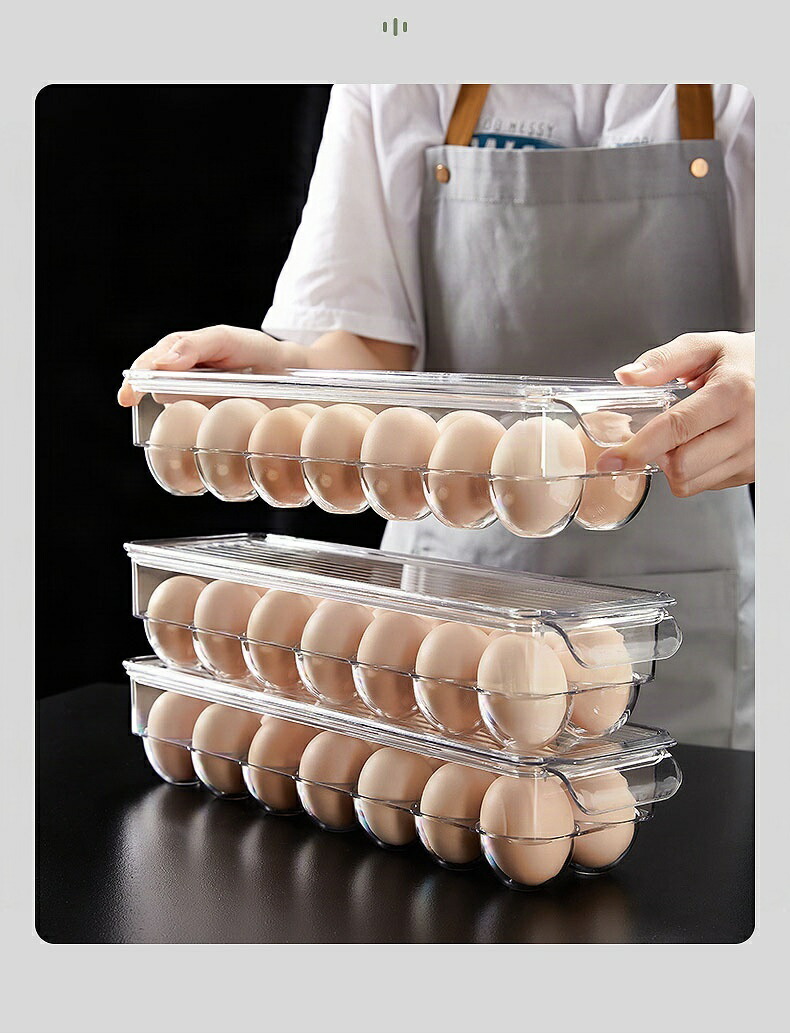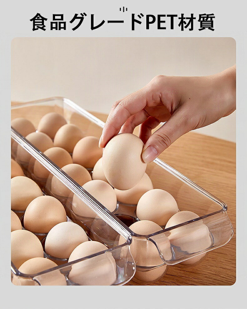 この商品について 【冷蔵庫用高品質エッグカートン】高品質のPET素材で作られており。 折れ曲がりにくく、耐久性に優れています。 輸送中の不安定や破損を防ぐため、卵はスロットにしっかりとフィットします。 【取り出しやすく、洗いやすい】この透明なエッグトレイを使えば、卵の残数が一目でわかります。 取っ手が付いているので、蓋を持ち上げるだけで簡単に卵を取り出せます。 普段使いにとても便利です。 手洗いできます。 食器洗浄機は使用できません。 【スタッキング可能&省スペース】 エッグオーガナイザーは、冷蔵庫から散らかった卵を取り除き、より広いスペースと整理整頓を提供します。 フタが硬いので積み重ねができ、冷蔵庫のスペースを最大限に活用できます。 【卵を新鮮に保つ】 収納キャディーには丈夫なプラスチック製のフタが付いているので、卵の保存状態が良く、他の臭いがつくのを防ぎ、卵の寿命を延ばします。 【幅広い用途】 エッグホルダーはパントリー、冷蔵庫、食器棚などに最適です。持ち運びが簡単で、ピクニックやキャンプにも使えます。 お母さん、おばあちゃん、家族へのクリスマスプレゼントにも最適です。この商品について【冷蔵庫用高品質エッグカートン】高品質のPET素材で作られており。 折れ曲がりにくく、耐久性に優れています。 輸送中の不安定や破損を防ぐため、卵はスロットにしっかりとフィットします。【取り出しやすく、洗いやすい】この透明なエッグトレイを使えば、卵の残数が一目でわかります。 取っ手が付いているので、蓋を持ち上げるだけで簡単に卵を取り出せます。 普段使いにとても便利です。 手洗いできます。 食器洗浄機は使用できません。【スタッキング可能&省スペース】 エッグオーガナイザーは、冷蔵庫から散らかった卵を取り除き、より広いスペースと整理整頓を提供します。 フタが硬いので積み重ねができ、冷蔵庫のスペースを最大限に活用できます。【卵を新鮮に保つ】 収納キャディーには丈夫なプラスチック製のフタが付いているので、卵の保存状態が良く、他の臭いがつくのを防ぎ、卵の寿命を延ばします。【幅広い用途】 エッグホルダーはパントリー、冷蔵庫、食器棚などに最適です。持ち運びが簡単で、ピクニックやキャンプにも使えます。 お母さん、おばあちゃん、家族へのクリスマスプレゼントにも最適です。